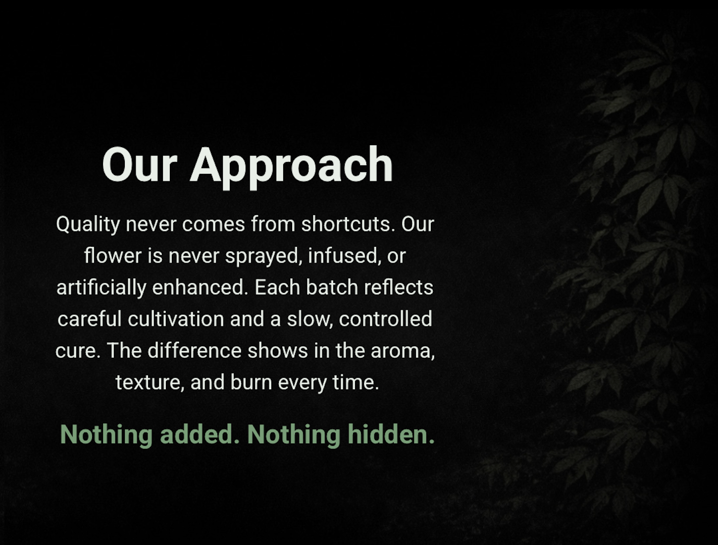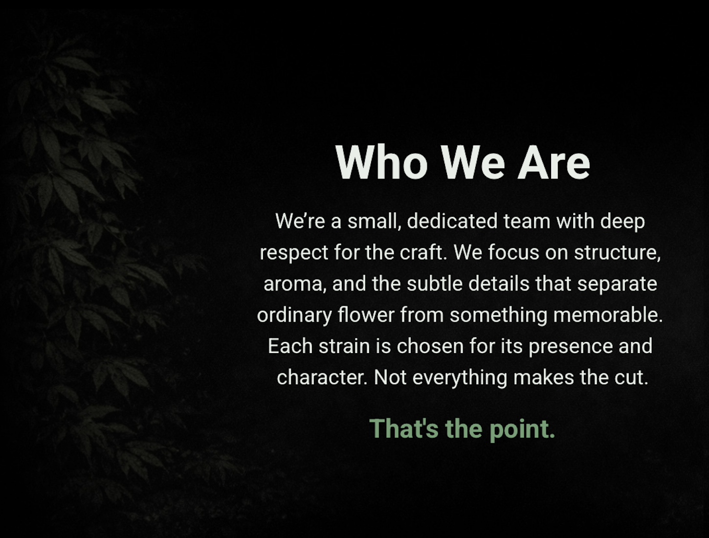 Founded on discretion, quality, and restraint, our focus is simple: exceptionally made THCA flower, handled with care from cultivation through cure. We don't chase trends, inflate numbers, or rely on gimmicks. Every release is intentional, and every batch meets standards we refuse to compromise.